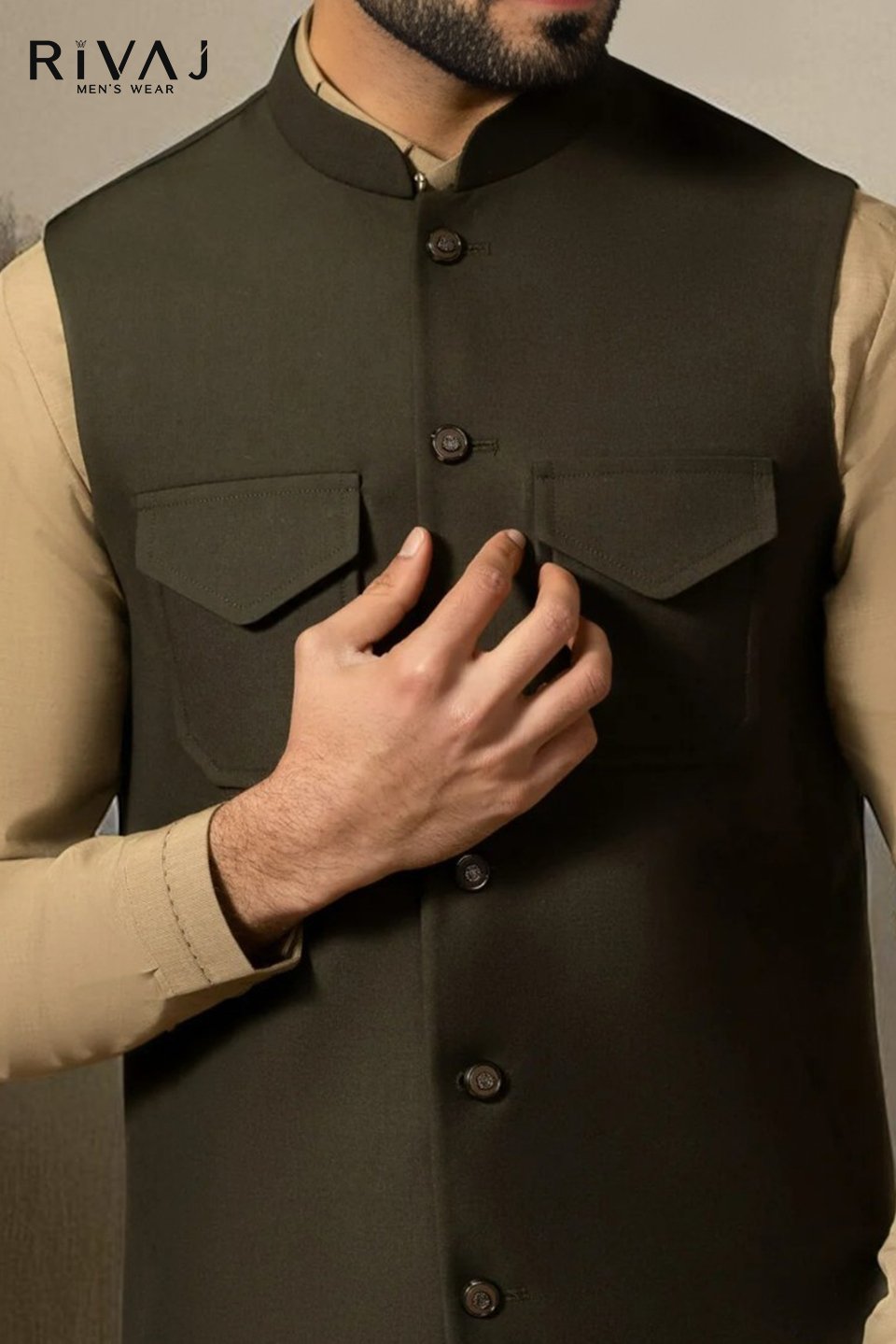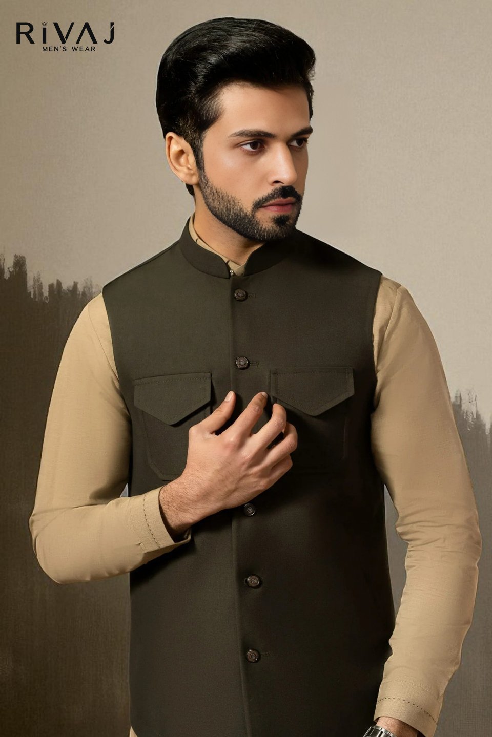 The Dark Camel Flap Pocket Waistcoat from Rivaj Men’s Wear is designed with premium fabric and stylish flap pockets that enhance both utility and fashion. Its rich camel tone brings a royal and graceful touch, perfect for weddings, barat, walima, Eid, and cultural celebrations. Pair it with kurta pajama, shalwar kameez, or formal attire for a sophisticated look. This waistcoat is crafted for men who appreciate timeless style with a modern edge.