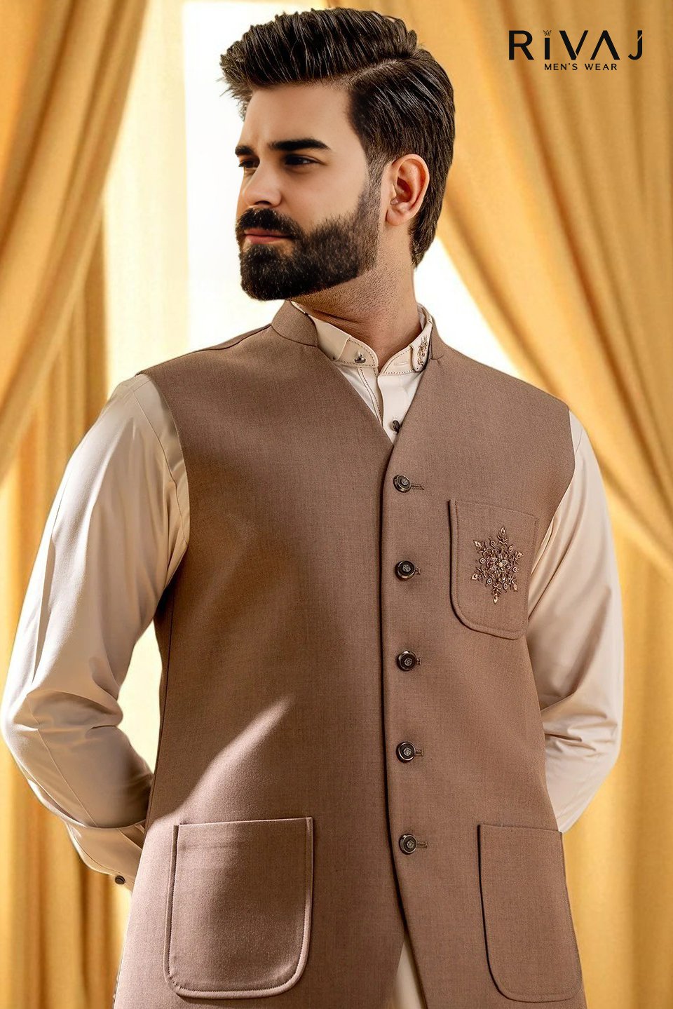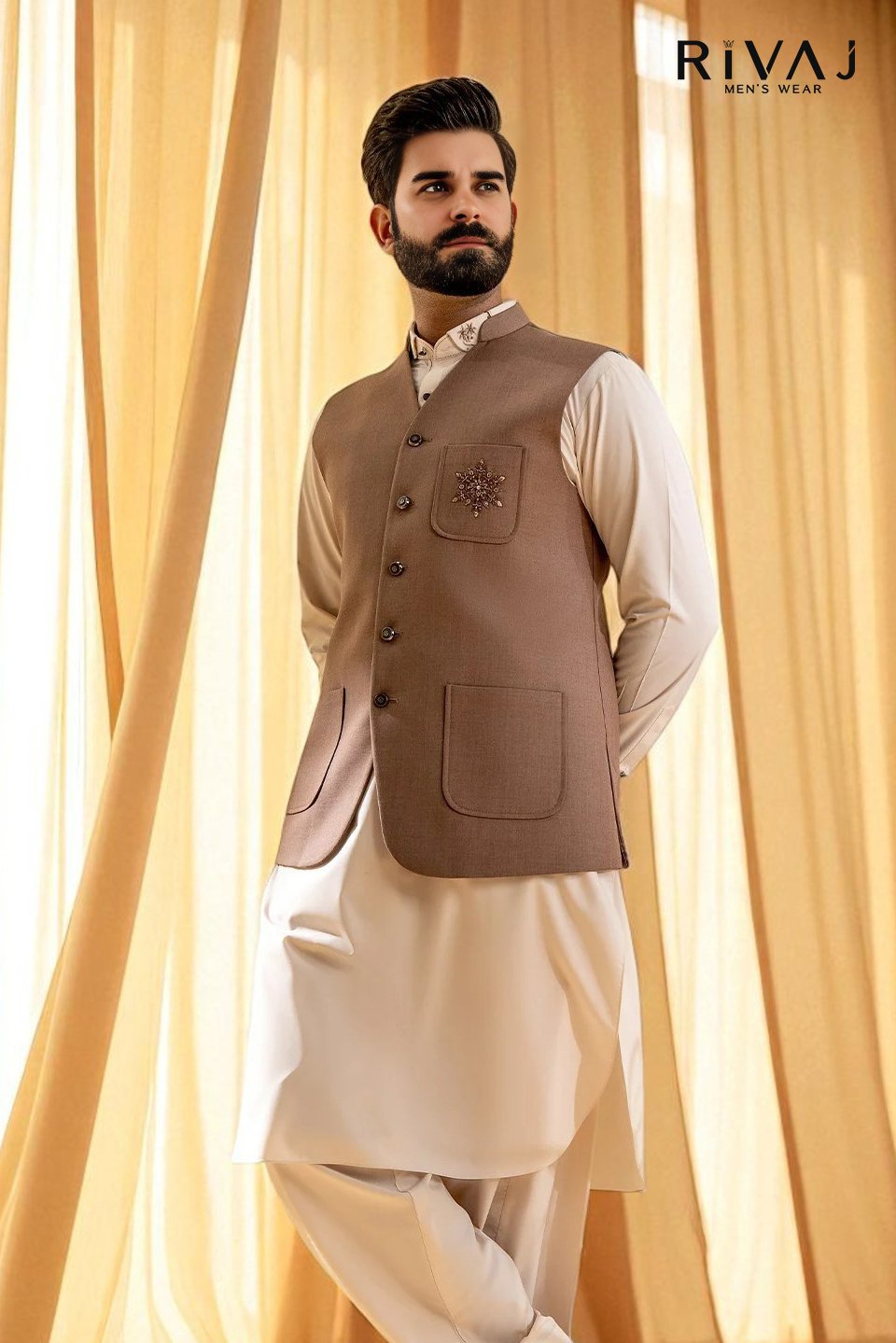The Sand Front Pocket Bunch Waistcoat from Rivaj Men’s Wear is a timeless piece designed for grooms, wedding guests, and festive occasions. Crafted in a versatile sand shade with a stylish front pocket bunch design, this waistcoat pairs perfectly with kurta pajama or shalwar kameez. Its premium stitching and elegant finish make it an essential addition to your traditional wardrobe. Ideal for barat, walima, and cultural celebrations.