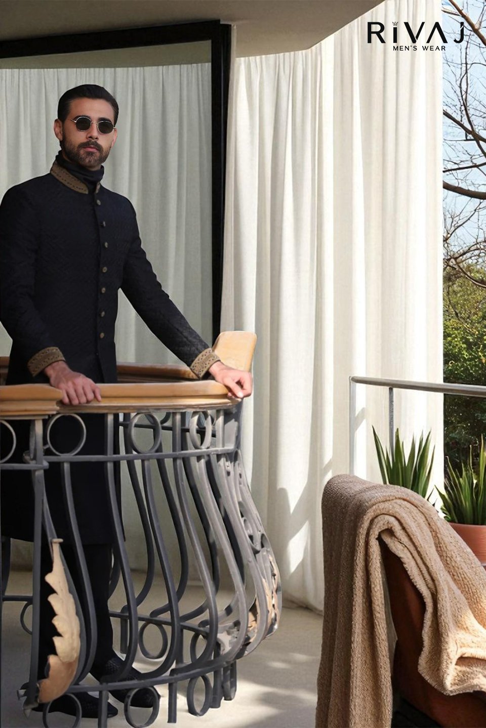 Black Sherwani with Golden Embellished Collar & Cuffs – Royal Groom Look